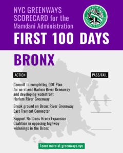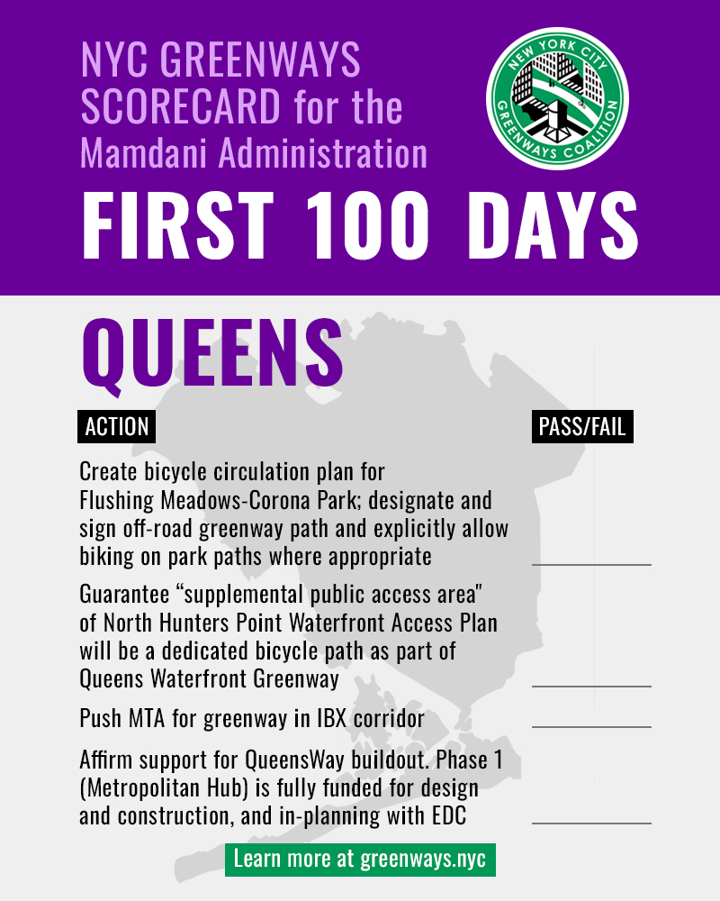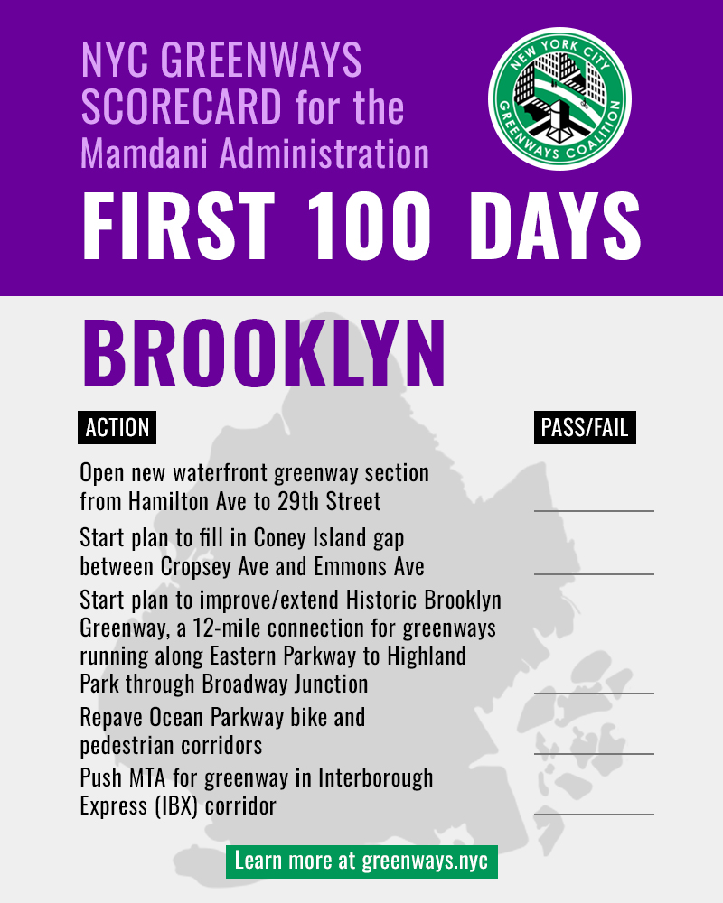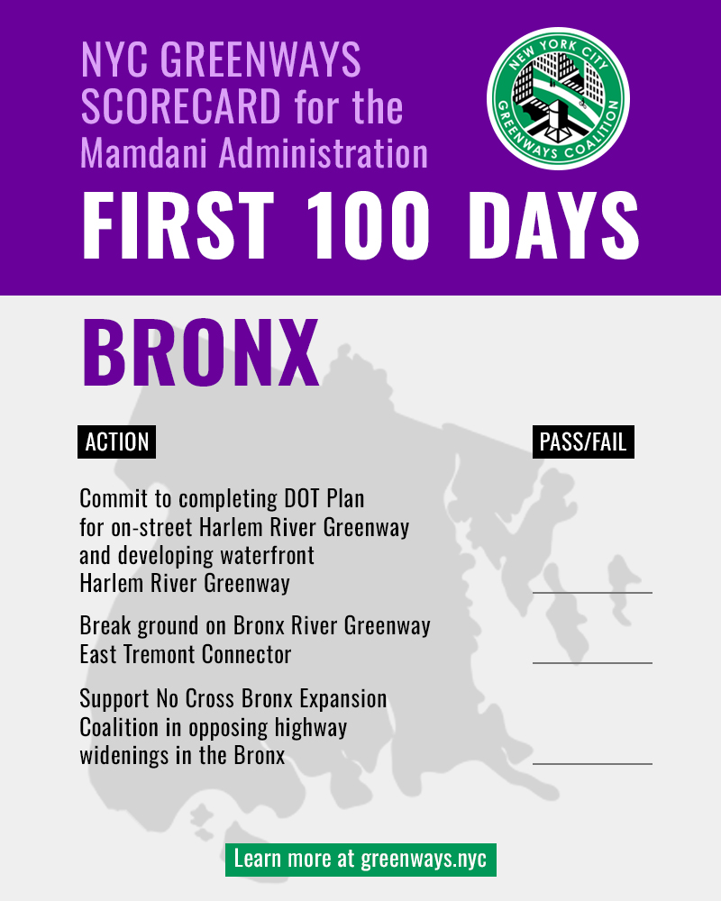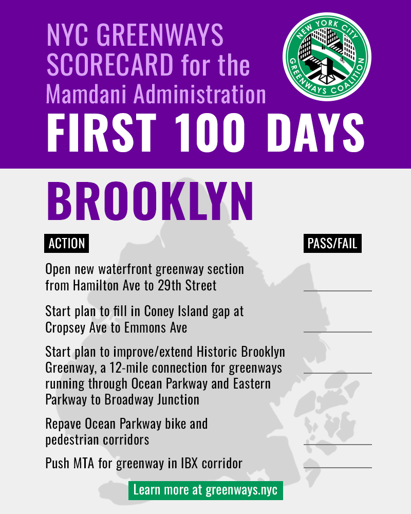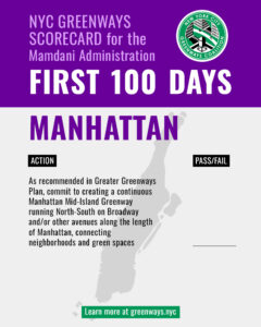 NYC Greenways Coalition — the alliance of more than 50 policy non-profits and all-volunteer community groups across New York City — is excited to release the NYC Greenways Scorecard. From the First 100 Days, through the First Year, and through the First Term, the scorecard is a living tool to identify priorities for the administration to advance the work of improving and expanding greenways significantly.