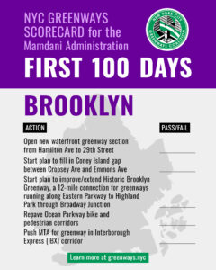 - Release implementation plans for Historic Brooklyn Greenway and Brooklyn Waterfront Gaps in Coney Island and Sunset Park. Complete protected bike lane on Neptune Ave to connect Shore Parkway and Jamaica Bay greenways.