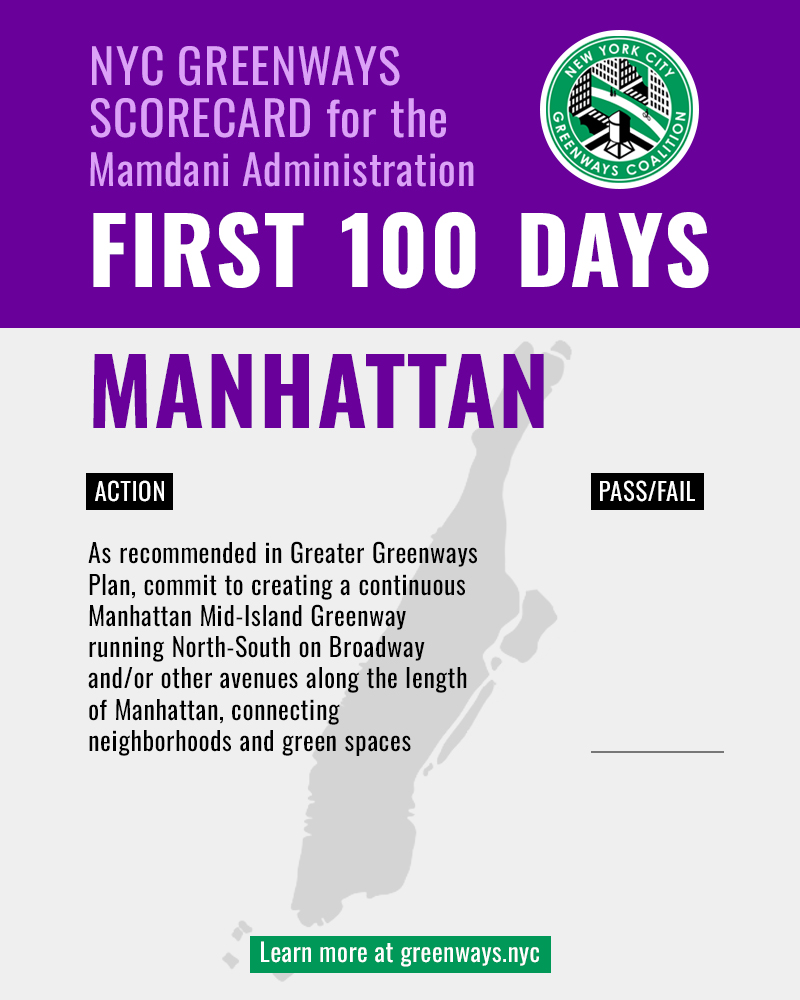 - As recommended in Greater Greenways Plan, commit to creating a continuous Manhattan Mid-Island Greenway running North-South on Broadway and/or other avenues along the length of Manhattan, connecting neighborhoods and green spaces