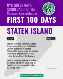 - Publicly announce a timeline to begin Staten Island Waterfront Early Action Corridor and invest in rezoning Richmond Terrace to mixed use to allow surrounding neighborhoods to fully realize the benefits of the Greenway